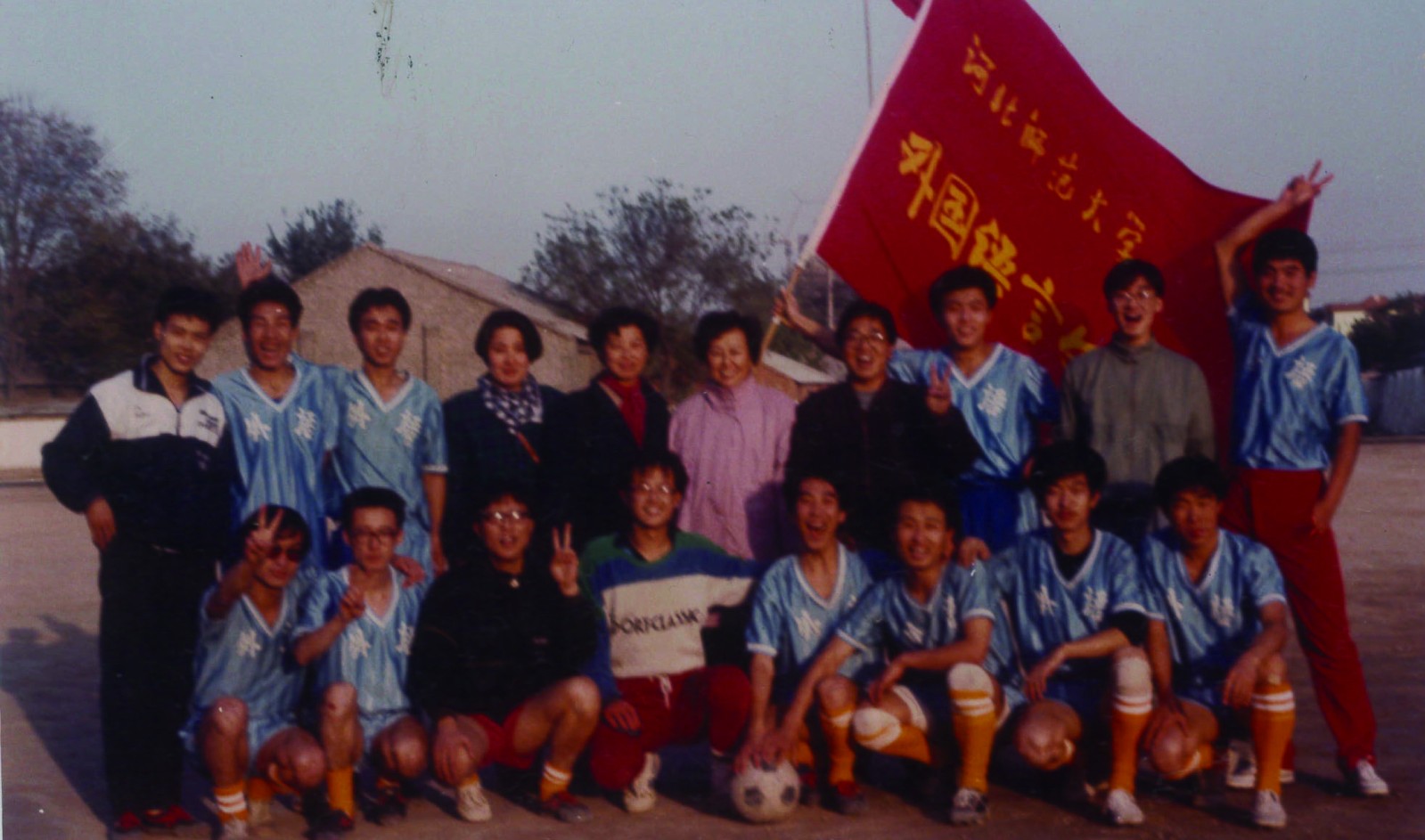 时任党总支副书记李雪梅老师,足球队主教练,时任团委书记九一九三辅导员赵颖楠老师和其他辅导员与大家一同庆祝胜利