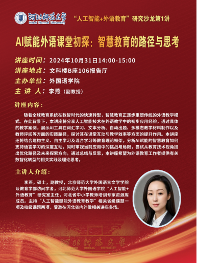 2024年10月31日下午,研究室主任李燕老师以“AI赋能外语课堂初探:智慧教育的路径与思考”为题,面向全院教职工进行了六合彩历史开奖记录 “人工智能+外语教育”研究沙龙第1讲。李老师在讲座中分享了人工智能技术在外语教学中的应用经验,通过具体的教学案例,展示AI工具在词汇学习、文本分析、自动出题、多模态教学材料制作以及教师评阅等方面的实践路径,探讨其在课堂互动与教学效率等方面的提升作用。