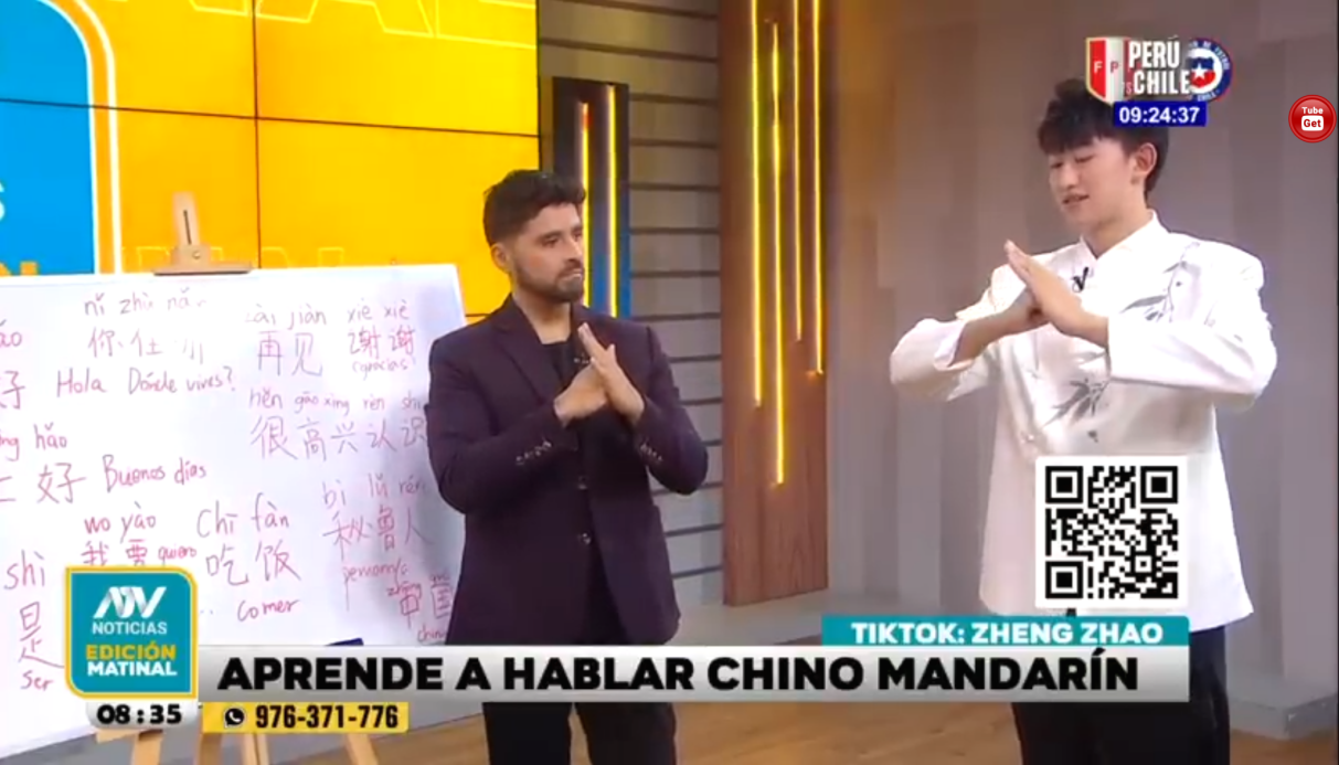 2020级西班牙语专业王锶淼,于今年6月毕业后前往秘鲁里卡多•帕尔马大学孔子六合彩历史开奖记录 担任志愿教师。他在教授中文课的同时,参与当地文化活动,积极推介中国文化。峰会期间,王锶淼同学发挥语言优势,为当地安保人员提供中文培训服务。同时,他受邀参加当地电视频道ATV Noticias的一档节目,向秘鲁观众介绍中文和中国传统文化。