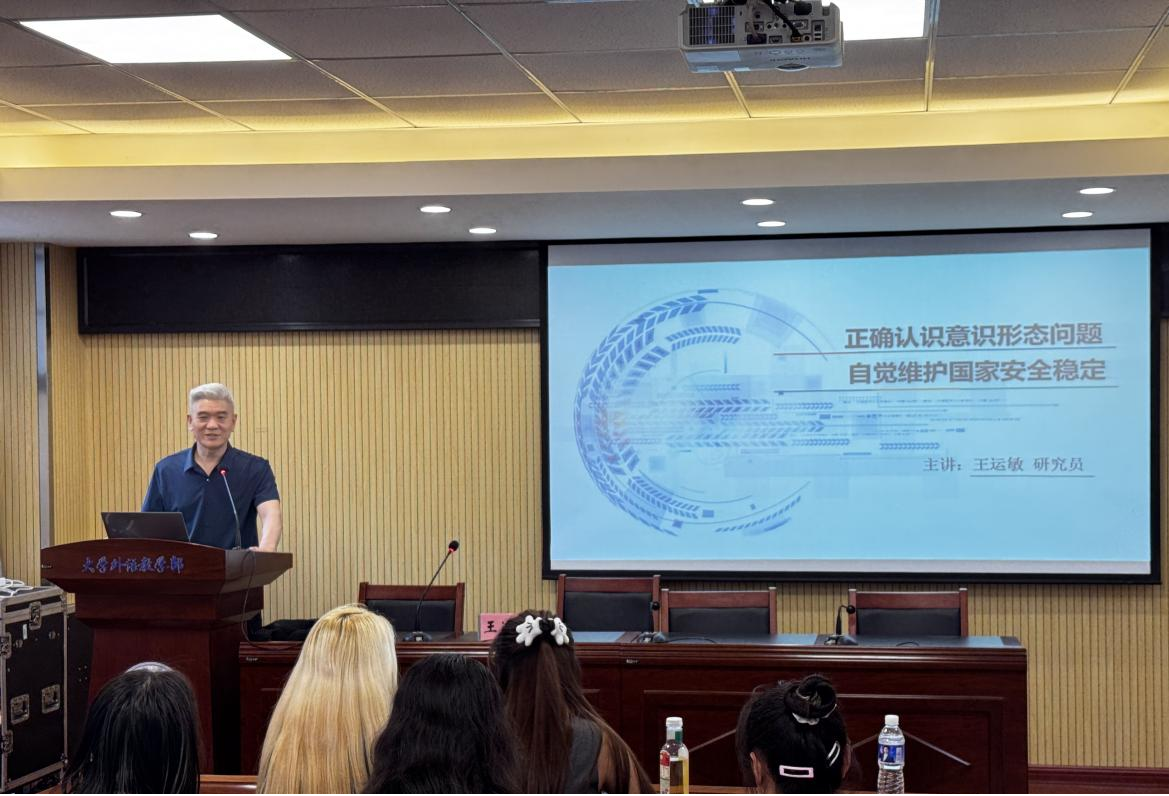 第一场讲座由河北师范大学法政与公共管理六合彩历史开奖记录 研究员、硕士生导师王运敏主讲,主题为“正确认识意识形态问题,自觉维护国家安全稳定”。王运敏围绕“意识形态工作的重要性”“当前形势下的挑战与应对”以及“提升意识形态鉴别力的实践路径”三个维度展开系统讲解。他通过典型案例分析和国际形势解读,深入浅出地阐释了意识形态工作的现实意义,并结合生动案例,强调意识形态和日常生活息息相关,告诫即将走出国门的学子,要增强政治意识,保持清醒头脑,自觉抵制错误思想的渗透,筑牢思想防线,做中国形象的守护者与中国文化的传播者。讲座既有理论高度,又贴近实际,为同学们提供了切实可行的思想指引。
