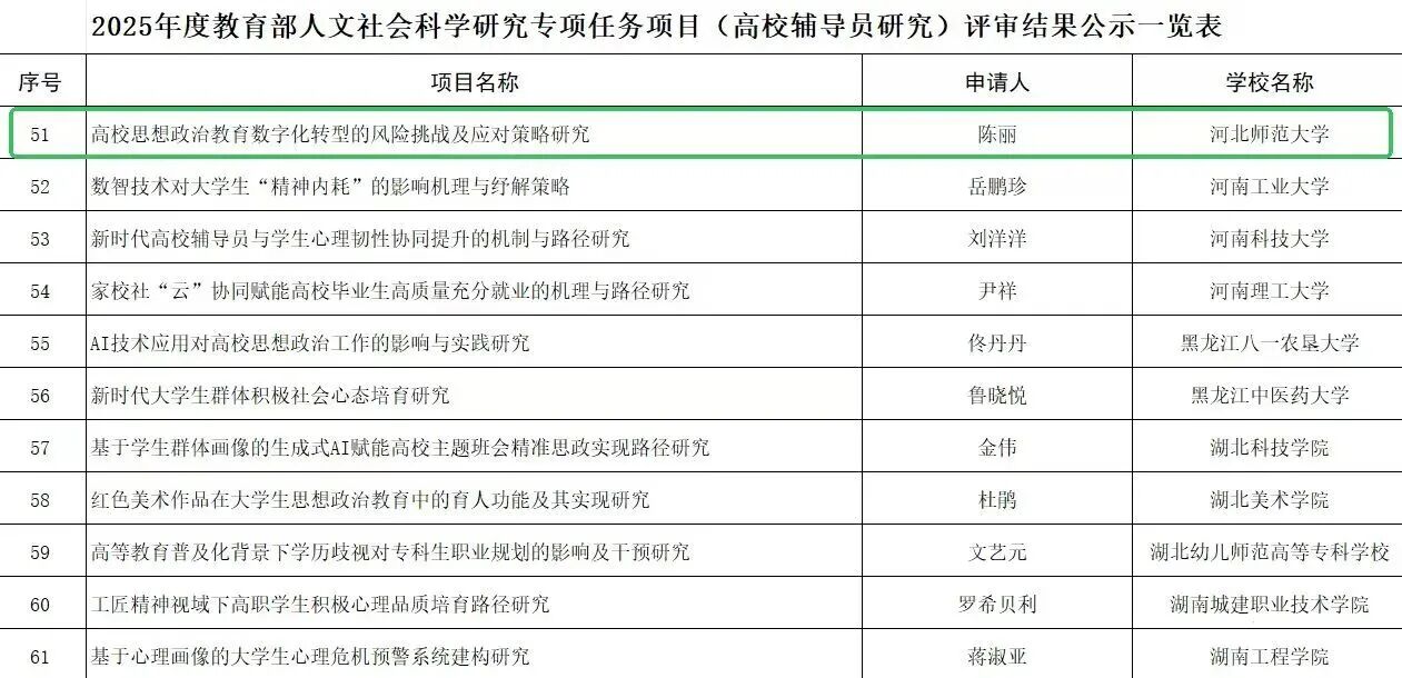 近日,教育部社会科学司公示了2025年度教育部人文社会科学研究一般项目立项结果,其中高校辅导员研究专项任务共立项212项,我院辅导员陈丽主持的《高校思想政治教育数字化转型的风险挑战及应对策略研究》成功获批立项。